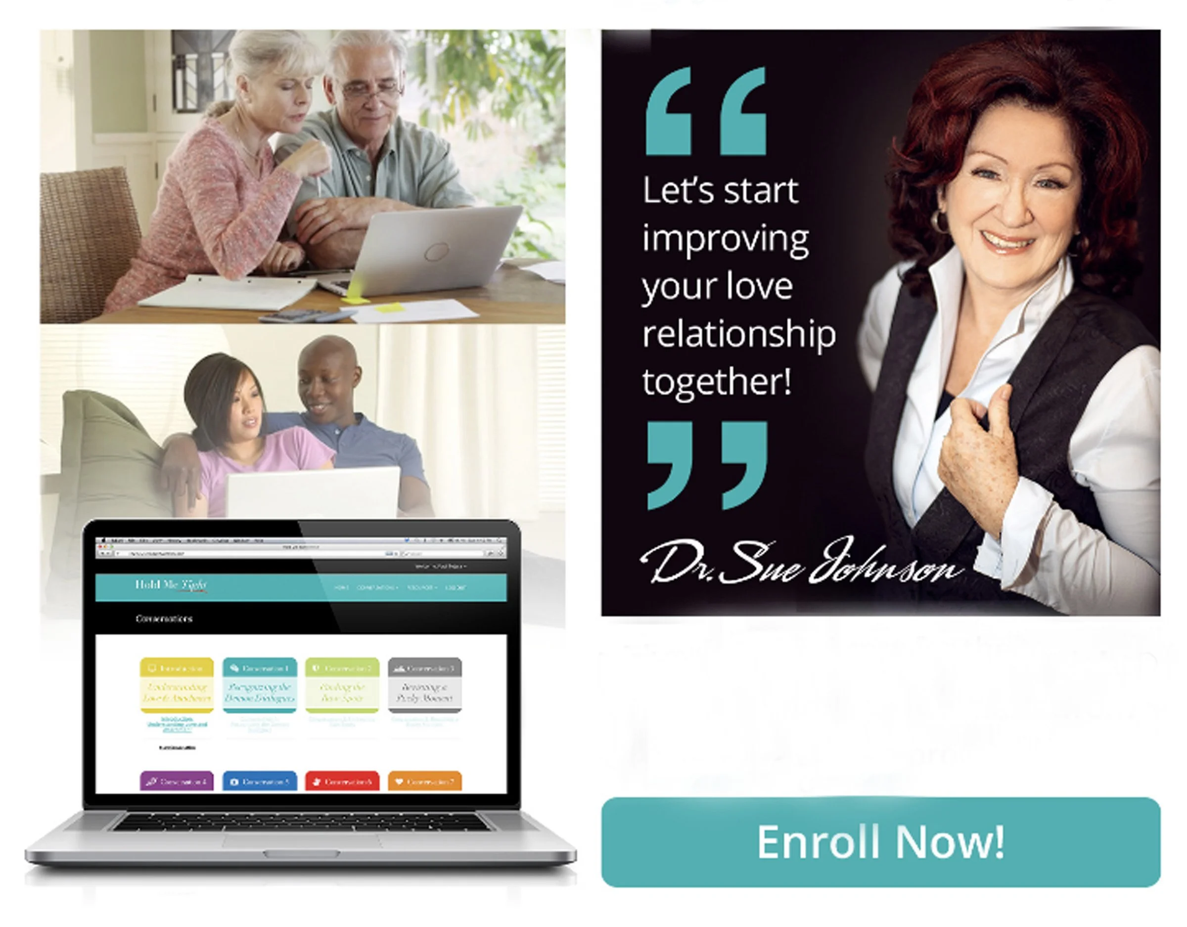 Hold Me Tight® is an educational program for couples based on EFT which has a combination of teaching segments from relationship experts, such as Dr. Sue Johnson, as well as videos of real couples working through the exercises, then opportunities for you and your partner to do exercises together to grow your bond. It is powerful and worth the investment!
